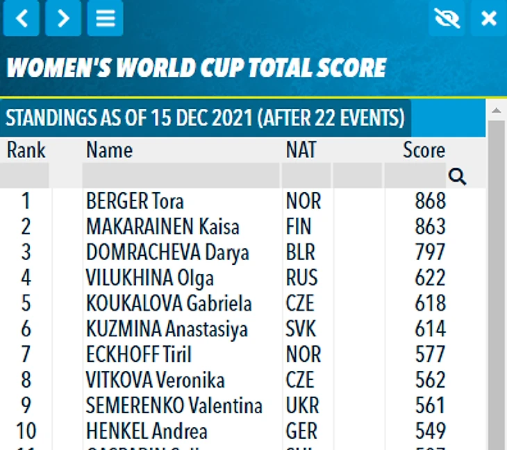 Изначально первое место занимала финка Кайса Мякяряйнен, которая сейчас переместилась на вторую строчку (863 очка).