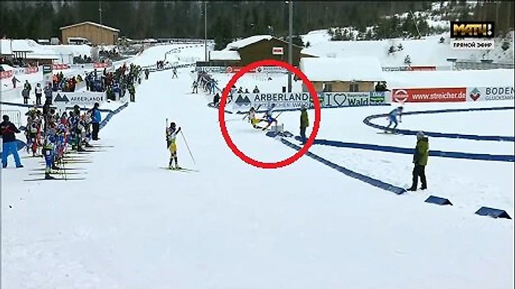 Российский биатлонист Антон Бабиков столкнулся с шведом Габриэлем Стегмайром во время сингл-микста на чемпионате Европы в Арбере.