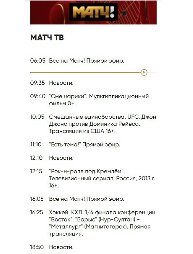 Вместо соревнований «Матч ТВ» покажет российский сериал «Рок-н-ролл под Кремлем» (с 12:15 до 16:05), затем в программе передача «Все на Матч!», далее – трансляция 1/4 финала Кубка Гагарина между «Барысом» и «Металлургом».