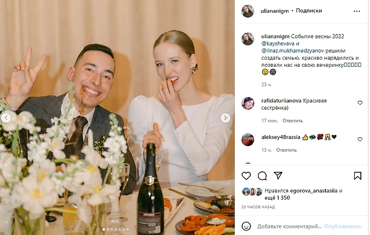 «Событие весны-2022. Анастасия и Ильназ решили создать семью, красиво нарядились и позвали нас на свою вечеринку», – написала Нигматуллина в соцсетях.