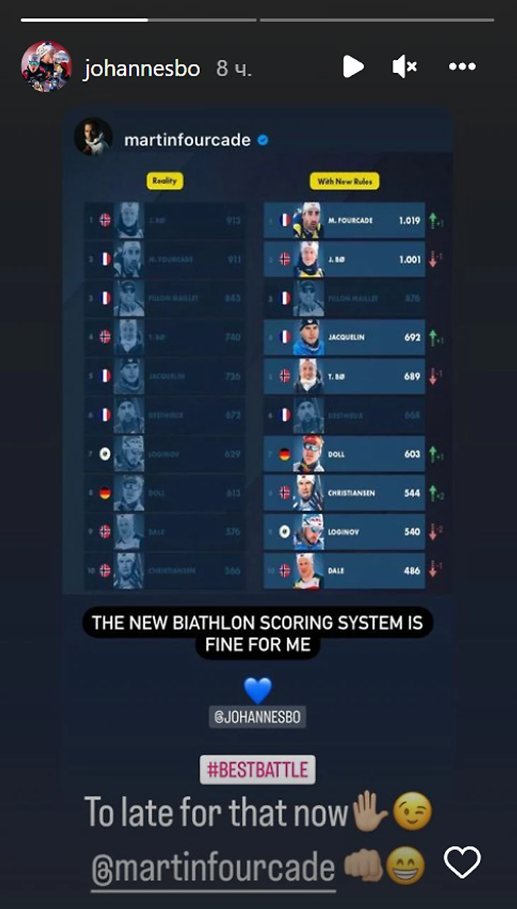 Фуркад опубликовал в сторис таблицу тотала за сезон-2019/20, где занял второе место вслед за Бо. Француз обратил внимание, что с новой системой IBU он бы на тот момент одержал победу.
