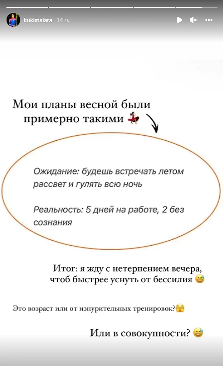 Лариса Куклина: «Я жду с нетерпением вечера, чтоб быстрее уснуть от бессилия. Это возраст, изнурительные тренировки или в совокупности?»