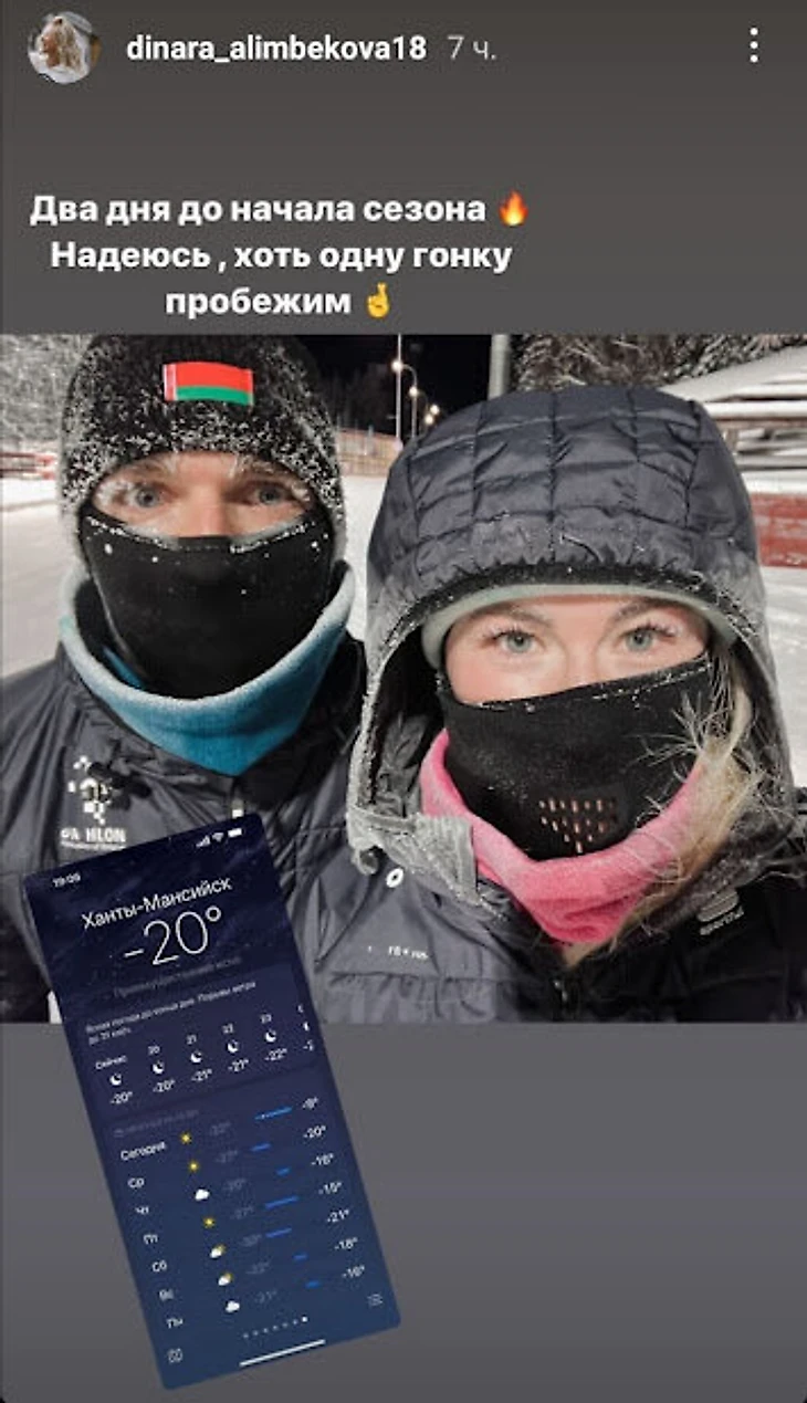 «Два дня до начала сезона. Надеюсь, хоть одну гонку пробежим», – написала Алимбекова, опубликовав совместную фотографию со своим мужем Антоном Смольским.