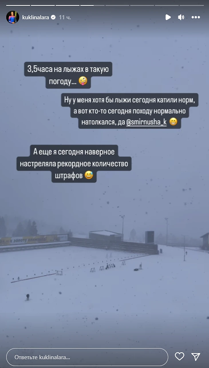 «3,5 часа на лыжах в такую погоду... Ну, у меня хотя бы лыжи сегодня катили норм, а вот кто-то сегодня походу нормально натолкался, да? (Куклина отметила аккаунт Екатерины Смирновой – Sports.ru)