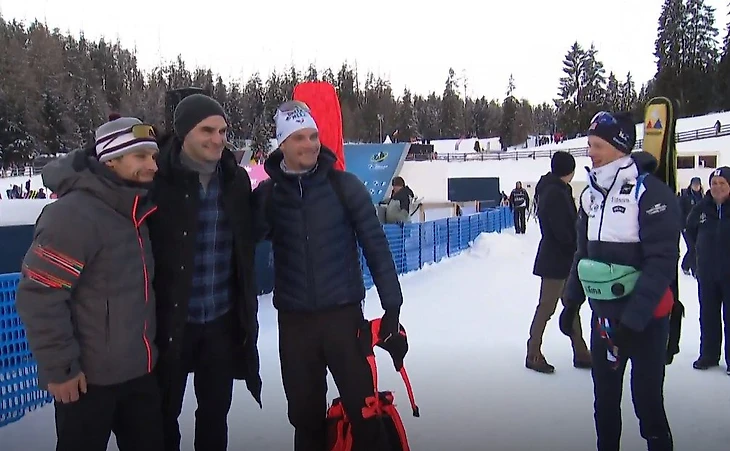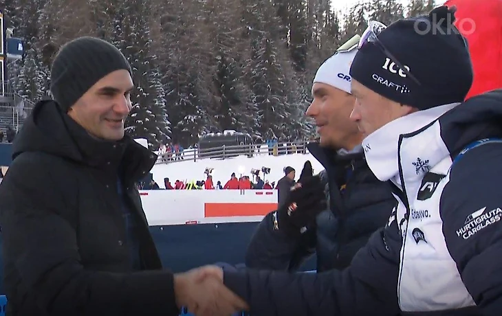Сегодня проходила мужская гонка преследования. Федерер попал в трансляцию, когда общался с биатлонистами Эмильеном Жакленом и Тарьеем Бо.