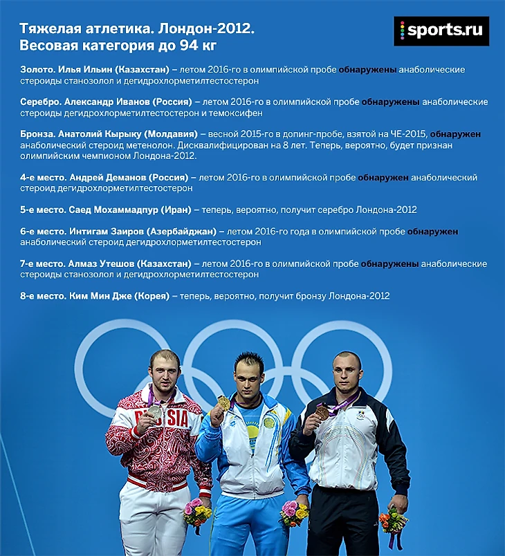 Или еще пример. Более для нас важный. Скоро решится судьба российских тяжелоатлетов – допустят ли их до Игр в Рио. И судя по последним новостям, с таким количеством положительных проб придется сидеть дома. Вчера после перепроверки лондонских допинг-проб у нас новые фигуранты.