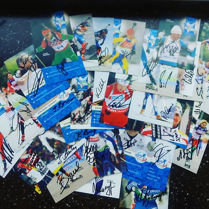 Не могу сказать, что многое потеряли, но увидеть биатлонистов вблизи, в состоянии "покоя" было достаточно интересно.. Кто-то, уткнувшись носом в автограф-карты, как из автомата, выпуливал заветные карточки. Кто-то участливо каждому заглядывал в глаза, вручая автограф. Юрию Кашкарову раздавать подписанные карточки помогала внучка. Сергей Рожков, подписывая карту, спрашивал имя и адрессовал свой автограф конкретному человеку, так на моей красуется неразборчивое "Оксане".. Мелочь, а приятно!! Спасибо Сергею за уделенное внимание!!