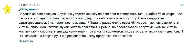 Sodovskaya пишет живо и интересно: настоящий трэвел-блог! Много внутренней кухни со сборов биатлонистов, разговоры со спортсменами, фотографии и крутые описания. Но не буду вас утомлять, приведу лучше нескольк комментариев от благодарных подписчиков блога.