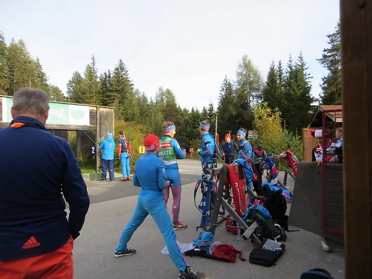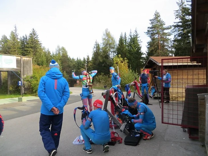 Как видите, Владимир Брагин уделяет внимание каждому.По окончании стрелковой тренировки биатлонисты пошли "на круг": кто просто бегом, а кто и на лыжероллерах.