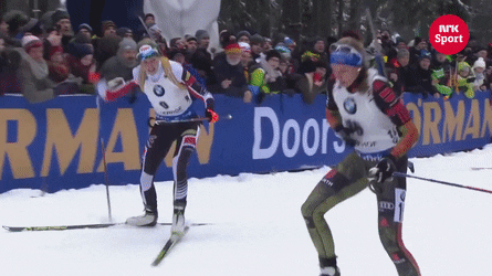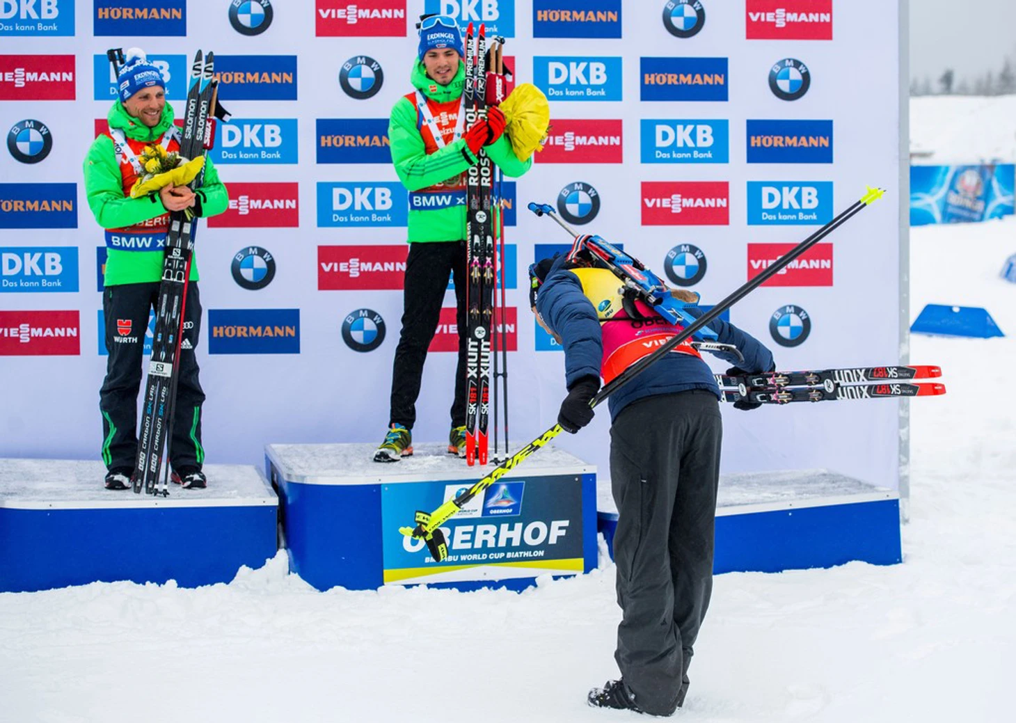 Третье и восьмое место любой спортсмен из пелотона может расценивать как успех, если только ты не Мартен Фуркад. Француз впервые в этом сезоне дважды за этап не поднялся на верхнюю ступень пьедестала. И если поражение в спринте связано в основном с промахами на рубеже (победу одержал Юлиан Эберхард), то в масс-старте Мартену попросту не хватило сил. Предприняв после рубежа попытку убежать от Симона Шемппа, француз не ожидал, что немец сможет подхватить его порыв и составить конкуренцию на последнем круге. Ну а пока дуэт лидеров соревновался на тактическом уровне, у Эрика Лессера открылось второе дыхание и он чуть было не вырвал победу на финише. На церемонии награждения Фуркад отдал должное дуэту из Германии, сообразив поклон в ноги.