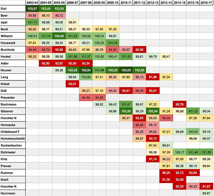 Не всегда количество медалей было точно по графику зависимости. Например на ЧМ в Хохфилцене (2005) и в Антхольце (2007) немецкие биатлеты "перевыполняли" план и брали на 1-2 медали больше, чем показывал график. С другой стороны ЧМ в Остерзунде (2008) и ОИ в Ванкувере (2010) сложились менее успешно, чем предполагало течение сезона.