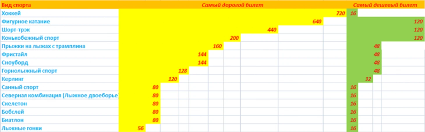В любом случае, билеты на виды спорта связанные с коньками, стоят значительно дороже, чем на виды спорта связанные с лыжами. И на это, конечно же есть свои причины. Например, одна из них заключается в том, что хоккей и фигурное катание считаются наиболее зрелищными и популярными видами спорта на Олимпийских Играх. В Сочи, билеты на два этих вида спорта были также самыми дорогими. Например, самый дорогой хоккейный билет в 2014-м стоил около 710 евро, а на показательные выступления фигуристов достигал 420, что дешевле чем на Играх в Южной Корее.