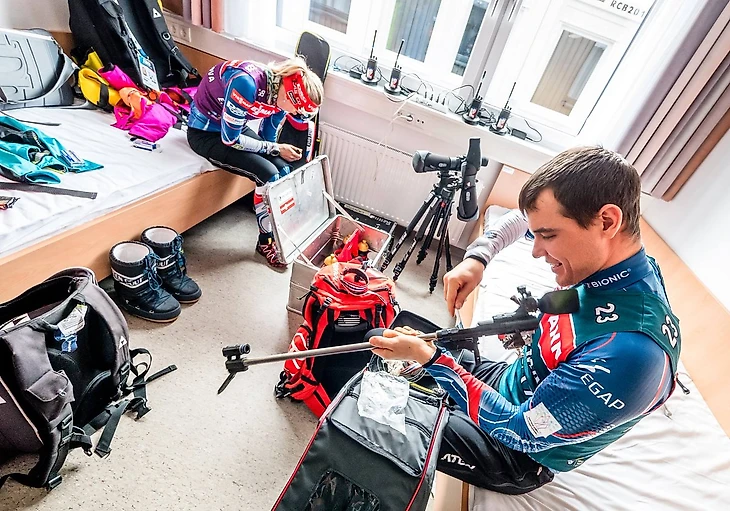 Биатлонисты и биатлонистки проводят последние приготовления к гонке. Чехи, до блеска начищают оружие: