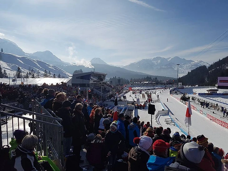 Билет на новенькую трибуну стоил 30 евро (1888 рублей). Стадион постепенно заполнялся. Болельщиков Австрии было много, но, интересно, что многие пришли без атрибутики. Чего не скажешь о поклонниках сборных Чехии и Германии, островки которых можно было видеть на всех трибунах. Поклонников сборной России в первый день соревнований собралось, скажем так, больше чем в Эстерсунде, но пока что меньше чем в Антерсельве.