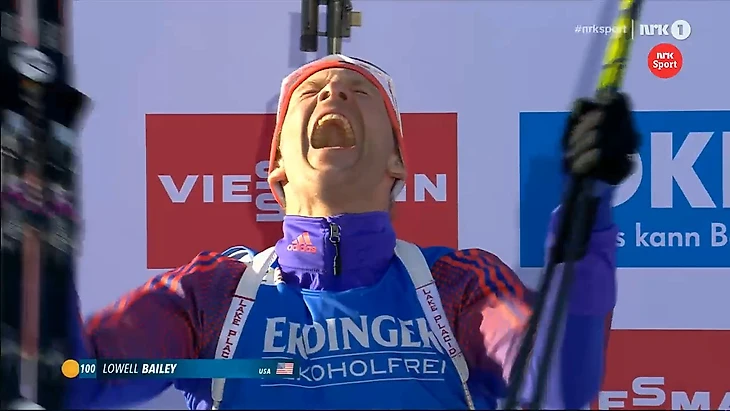 Стартовавший третьим с конца Лоуэлл Бэйли сумел преподнести сюрприз болельщикам американской сборной. Точная стрельба позволила американцу завоевать первую золотую медаль в истории для США на чемпионатах мира. 35-летний спортсмен до конца гонки держал в напряжении любителей биатлона, а на финише показал те самые эмоции, за которые мы любим биатлон.