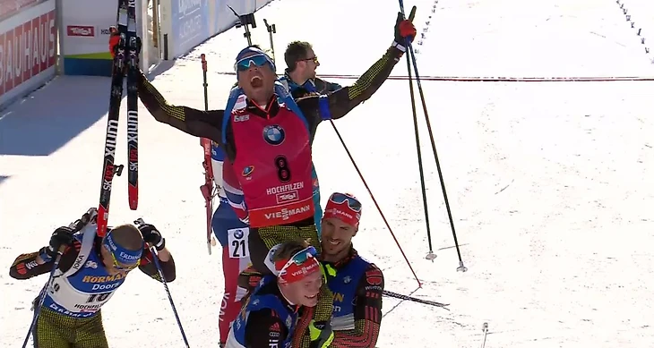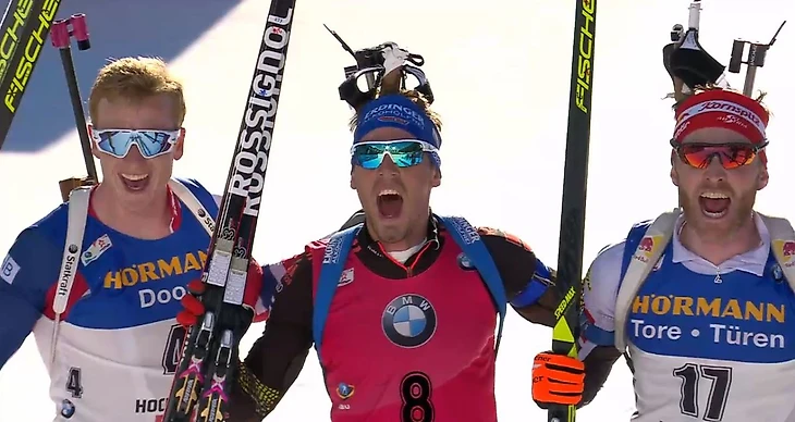 Немецкий биатлонист Бенедикт Долль на 0,7 секунды сумел опередить Йоханнеса Бё. А если быть точнее, то это норвежский спортсмен проиграл Бенедикту на финише доли секунды. Немец с волнением наблюдал за финишем Йоханнеса, а затем выплеснул все свои радостные эмоции, празднуя победу с командой.