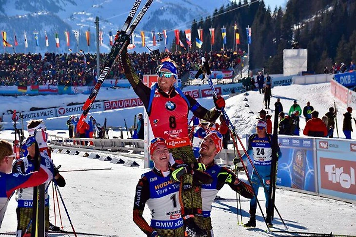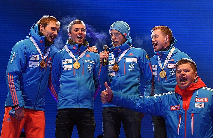 В декабре казалось, что у сборной России есть всё и все, чтобы наконец-то завоевать медаль на чемпионате мира. Четверка Максим Цветков-Матвей Елисеев-Антон Бабиков-Антон Шипулин казалась наиболее перспективным вариантом состава эстафеты на главный старт сезона. К самой эстафетной гонке чемпионата болельщики подошли не с самыми радужными ожиданиями. Состав Алексей Волков-Максим Цветков-Антон Бабиков-Антон Шипулин не вселял уверенности. Вызывали опасения и мечущийся между Риднау и Хохфильценом Алексей Волков, и провалившие спринт Максим Цветков и Антон Бабиков. Но отсутствие Евгения Гараничева в эстафетной четверке придавало уверенности в том, что гонка пройдет для российской сборной без штрафных кругов. Так и случилось. Первая за последние четыре чемпионата мира классическая эстафетная гонка без дополнительных кругов. Стоит отметить практически идеальную стрельбу российских спортсменов (всего 3 промаха), и её феноменальную скорость (на 33 секунды быстрее спортсменов остальных сборных). Блестящая стрельба в совокупности с хорошей скоростью и невероятным настроем на гонку позволила российской команде одержать долгожданную победу.