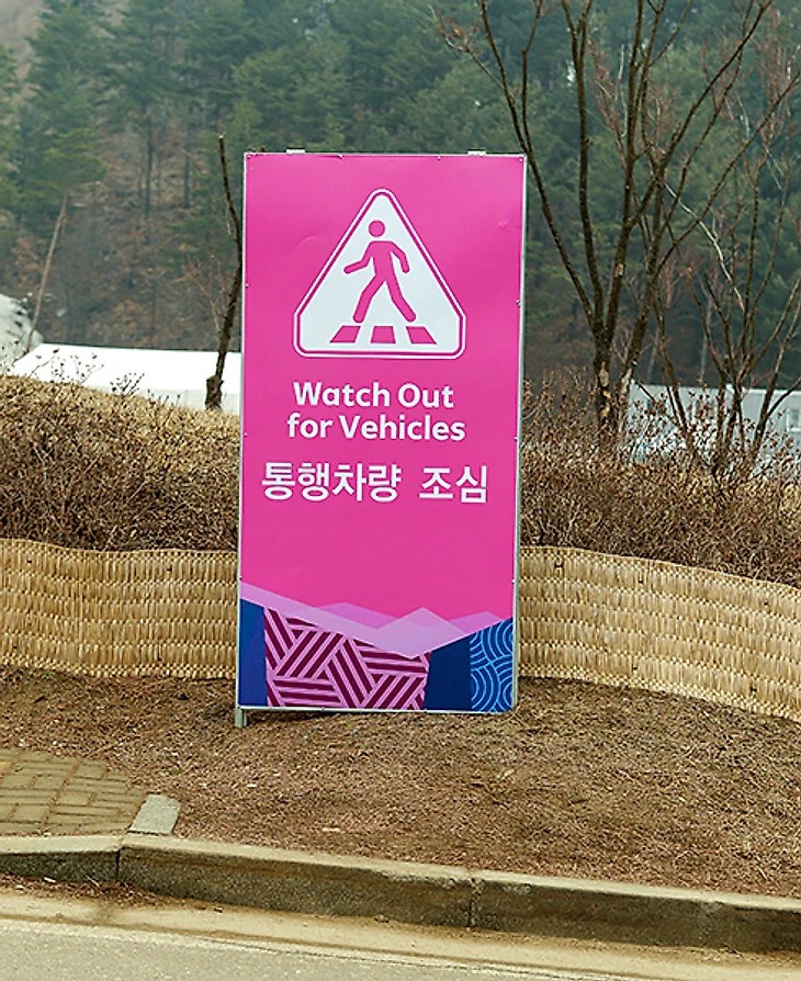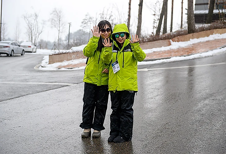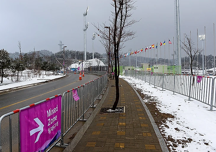 Все корейцы вполне дружелюбны, почтительны, веселы. Готовы помочь, если вдруг. Стадион, особенно вечером, похож на сочинский. Очень много вышек освещения, трасса достаточно сложная. Много крутых подъемов и спусков. Об этом еще в 2009-м писали и говорили.