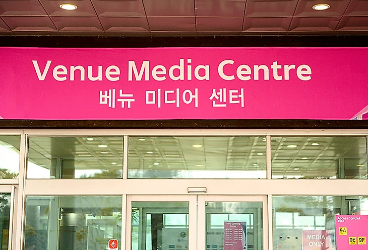 Зато на стадионе можно учить корейский язык. Стоит только читать вывески и запоминать. Пресс-центр, как и на ЧМ-2009, расположен в здании гольф-клуба. И вообще, стадион находится на территории гольф-клуба.
