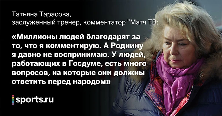 «Я по телевидению говорю то, что вижу. На мое место хотят посадить того, кто будет говорить, что в российском фигурном катании все гладко. Травля инициирована Аллой Шеховцовой, нашим судьей по танцам. С Родниной они не вместе. Они с разных сторон, наверное. А может быть, и вместе».