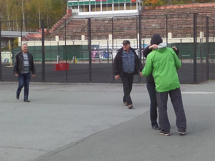 В нашу сторону шли еще трое болельщиков. Они сразу же начали здороваться и обниматься с Валерием Николаевичем.