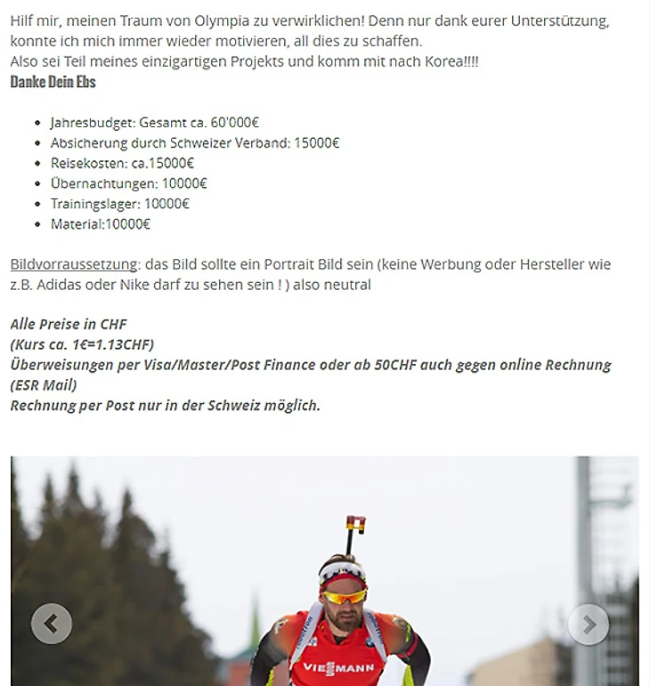 «Моя мечта – снова выступить на зимней Олимпиаде, и вы можете помочь ей осуществиться. Если вы поддержите меня пожертвованием, в качестве благодарности я размещу ваше фото на своей винтовке, и вы вместе со мной отправитесь на Олимпиаду».