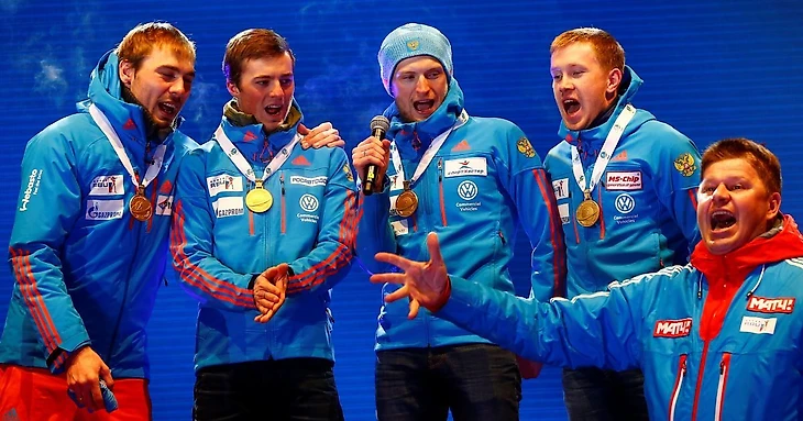 Шикарная эстафетная гонка для нашей сборной.Приятное воспоминание с чемпионата мира.Исполнение гимна под руководством Губерниева.Плюс к этому подаренная шуба Александра Тихонова - Антону Шипулину!