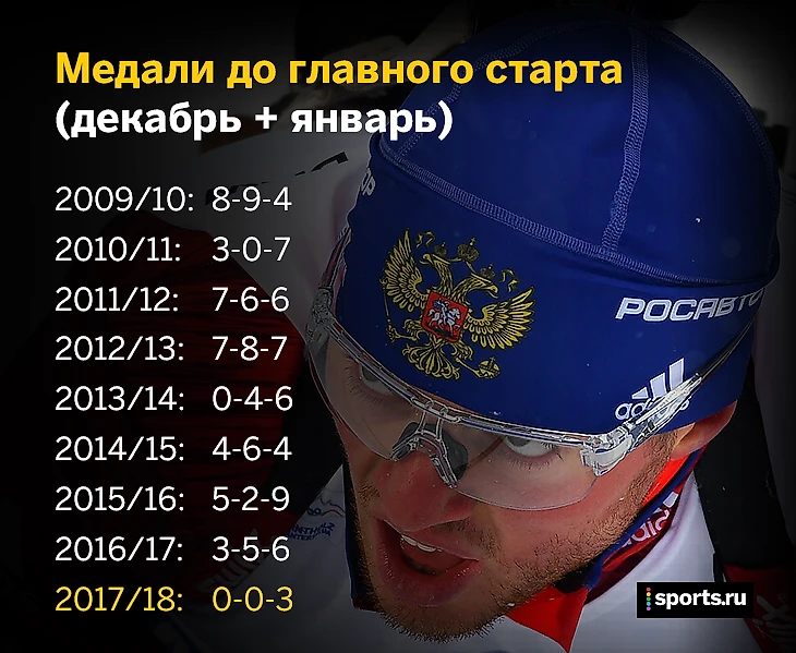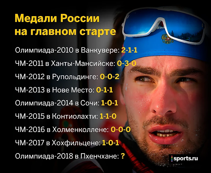 • Перед Олимпиадой в Сочи на этапах Кубка мира тоже не было побед: правда, формально один раз Россия выиграла – мужскую эстафету в Анси, результаты которой аннулировали из-за допинга у Александра Логинова.