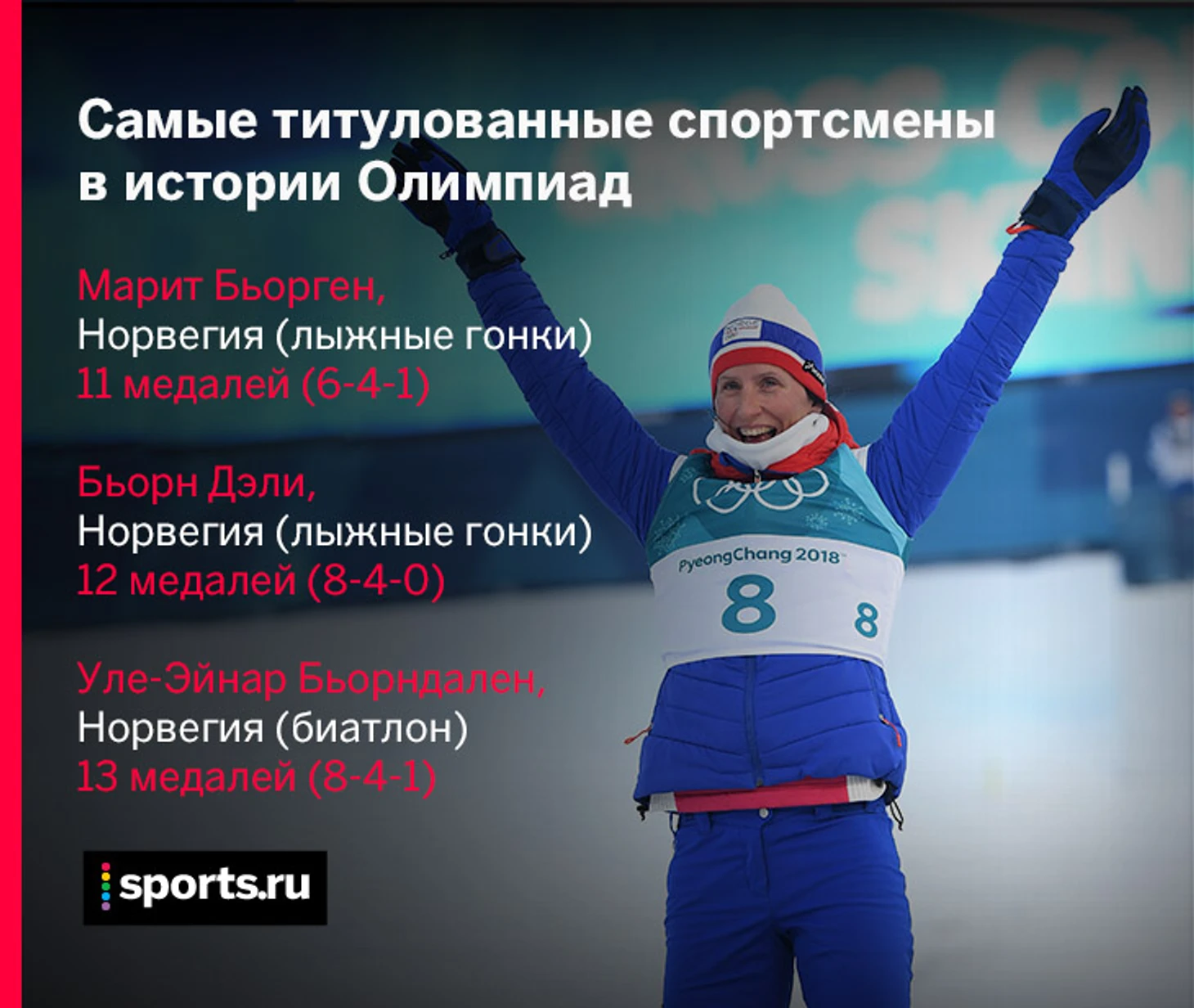Больше Бьорген на зимних Олимпиадах медали завоевывали только ее соотечественники – лыжник Бьорн Дэли и биатлонист Уле-Эйнар Бьорндален. Ни тот, ни другой не увеличат количество наград, а вот Бьорген еще может выступить в четырех гонках Пхенчхана-2018: командный спринт, гонка с раздельным стартом, эстафета и марафон. Личный спринт, где многие сильнее, Марит пропустит.