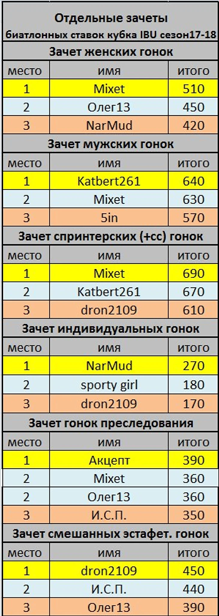 Mixet выиграл сразу два зачета в спринтах и женских гонках, Katbert261 в мужских гонках, NarMud - в индивидуальных, акцепт - в преследовании, dron2109 - в смешанных эстафетах. и поздравления всем призерам..