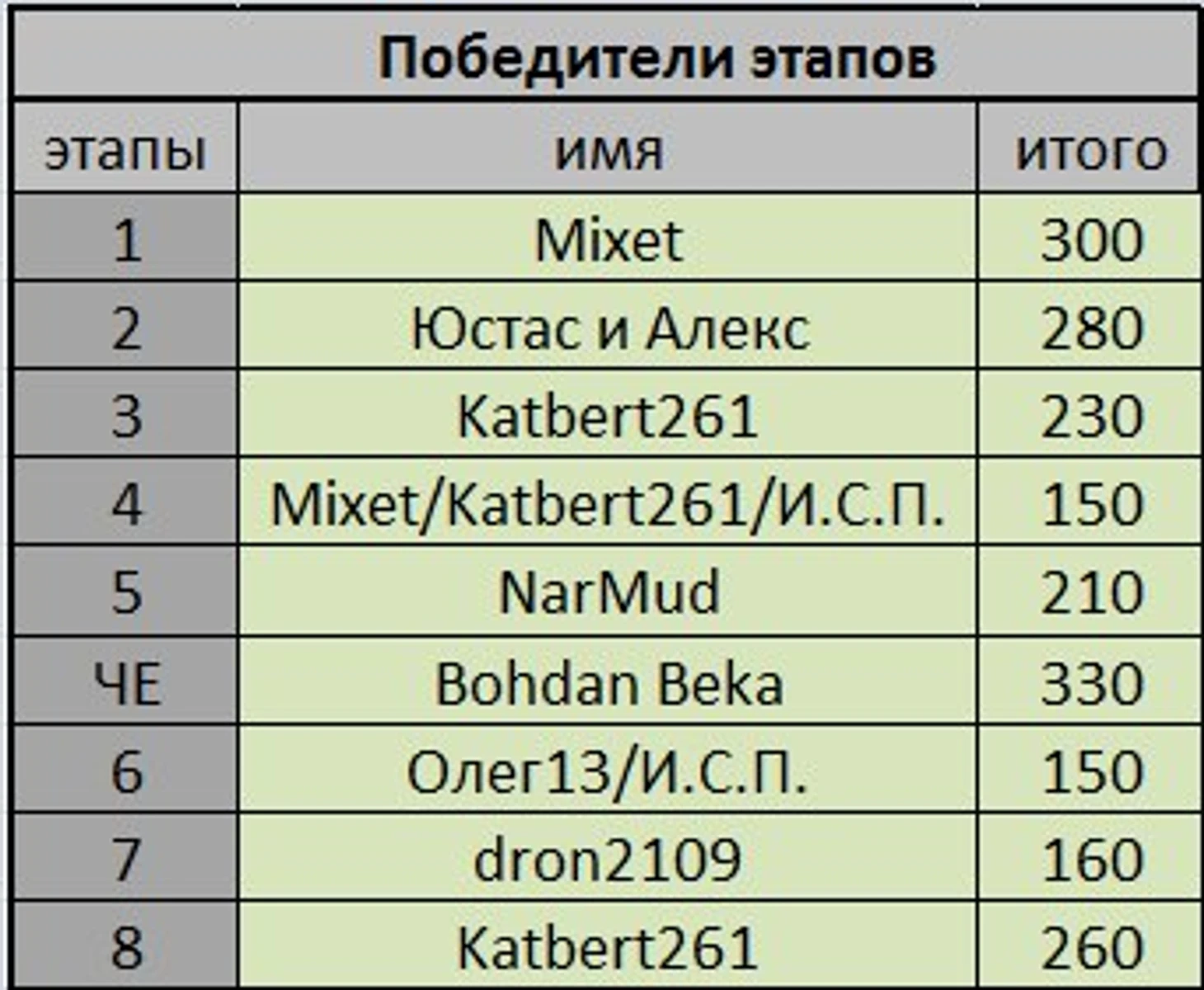 У нас было 8 этапов и Чемпионат Европы, вспомним победителей этапов. Katbert261 чисто 2 раза!