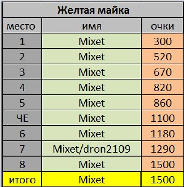 Итоговая таблица победитель Mixet. второй-dron2109, третье место разделили Олег13 и И.С.П. ПОЗДРАВЛЯЮ!!!