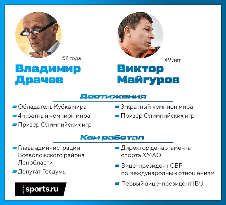 Кандидата, по сути, два – чемпионы мира Виктор Майгуров и Владимир Драчев, вместе побеждавшие в 90-е. Есть еще Дмитрий Алексашин, которому в сентябре исполнится 70. Он пережил в СБР всех. Но его заявка – чисто техническая; Дмитрий Яковлевич снимется в пользу фаворита непосредственно перед голосованием в надежде продлить свою жизнь в биатлоне.