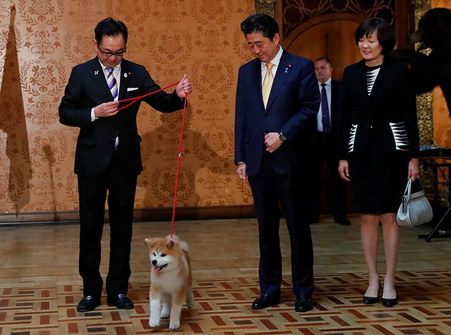 Эндо Такаси, глава Ассоциации сохранения чистоты породы акита-ину, премьер-министр Синдзо Абэ с женой