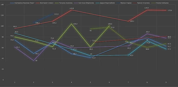 Что до нынешнего состава сборной, то встречались отдельные проблески в лице от тех, от кого это, в принципе, ждёшь: Юрлова-Перхт и Виролайнен, и одного луча надежды для болельщиков в лице Мироновой, а также задаток для дальнейшего роста в лице Кайшевой, но общая картина - норма женского российского биатлона последних шести сезонов. Отставания указаны в секундах.