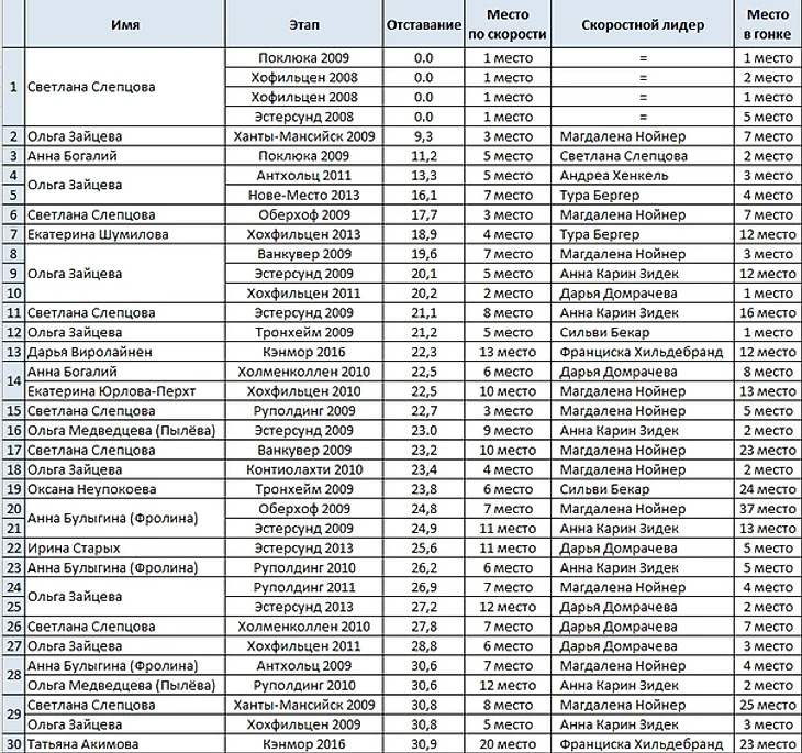 Сейчас российские биатлонистки довольно редкие гости в списке самых скоростных девушек на дистанции, и прошедшие сезоны приучили болельщиков к тому, что проигрыш скоростному лидеру от минуты и дальше - это норма. Но бывали случаи, когда некоторые выбегали из этой злосчастной минуты. Кто-то прилагал большие усилия, что выходило меньше пятидесяти секунд. Выходило порой и так, что от лидера по скорости россиянки оказывались в фантастических сорока секундах. Но обратим внимание на такие чудеса, когда наши девушки находились от Домрачевой, Мякяряйнен и Нойнер в полуминуте - сейчас в это, конечно, трудно поверить, но подобное имело место быть за минувшие десять сезонов.