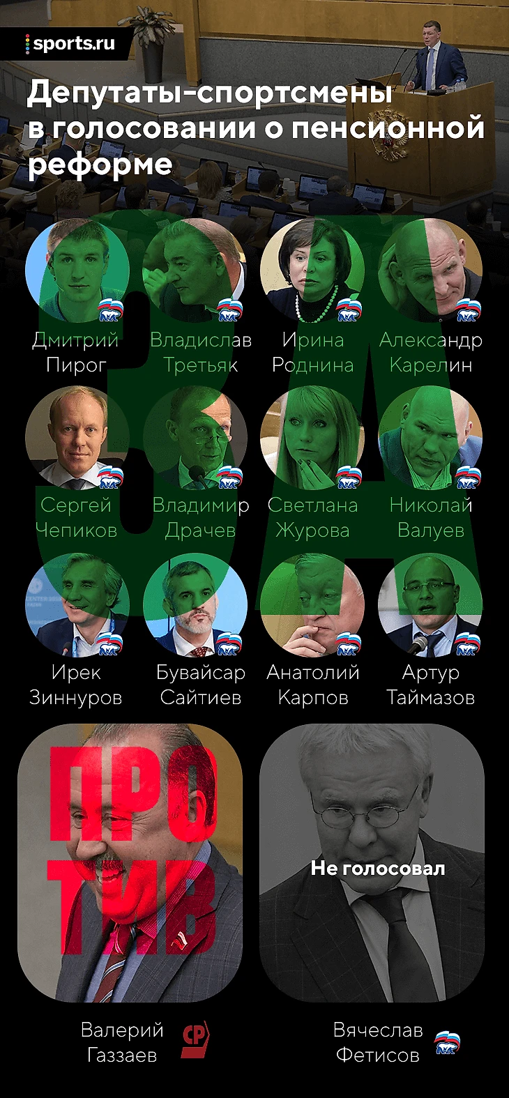 Среди депутатов – 14 имели или имеют отношение к профессиональному спорту. 13 из них представляют «Единую Россию», только Валерий Газзаев – «Справедливую Россию». Газзаев – единственный среди «спортсменов», кто проголосовал против. «Единорос» Вячеслав Фетисов не участвовал в голосовании.