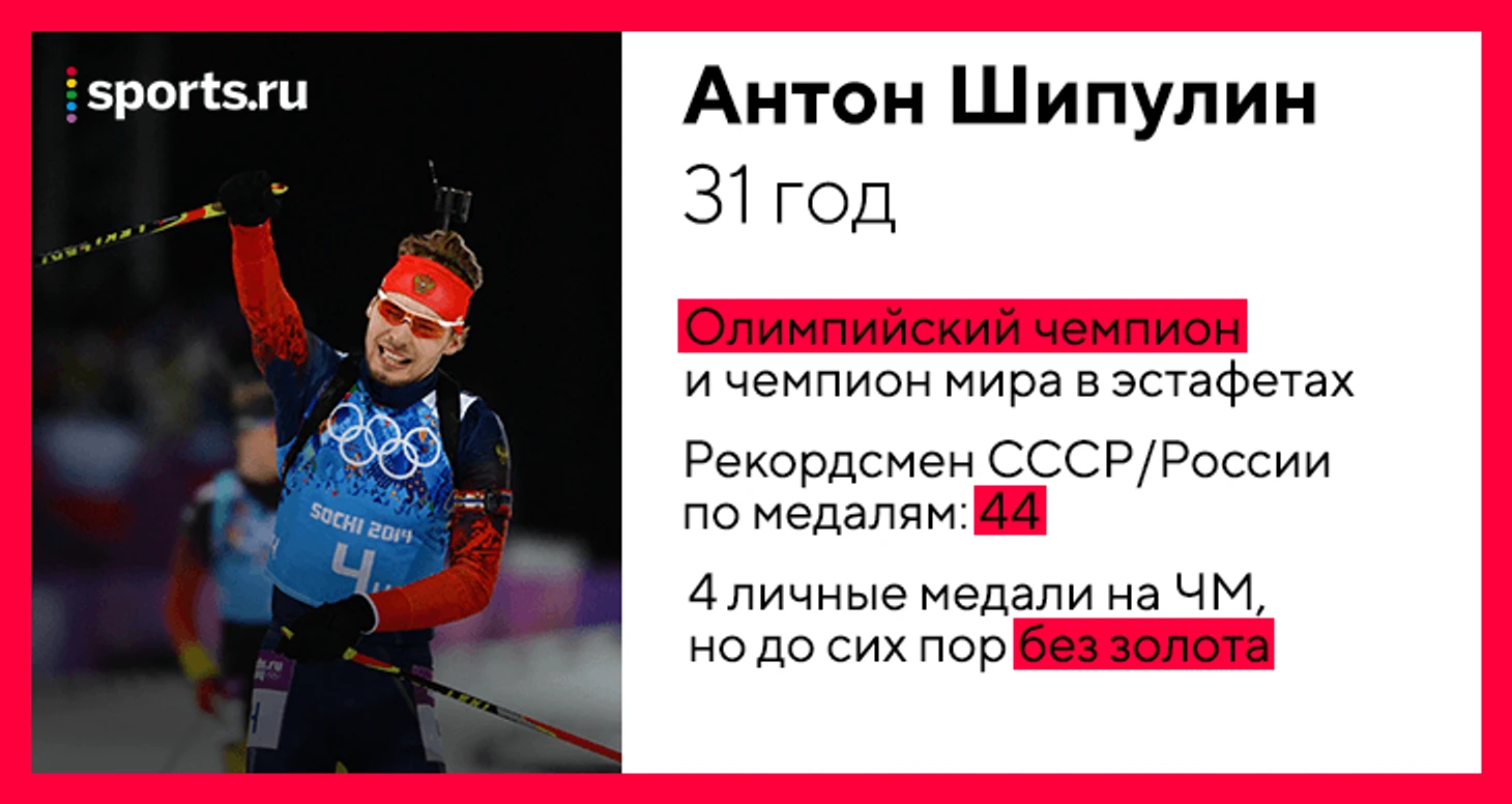 • Четыре года подряд Антон финиширует по итогам сезона в топ-3. Все эти годы главный русский биатлонист готовился в мини-группе – вне «большой» сборной с Андреем Крючковым и Андреем Гербуловым. Правда, пострадал результат на главных стартах: с трех предыдущих ЧМ Шипулин увез лишь одно личное серебро, а на Олимпиаду не поехал по решению МОК.