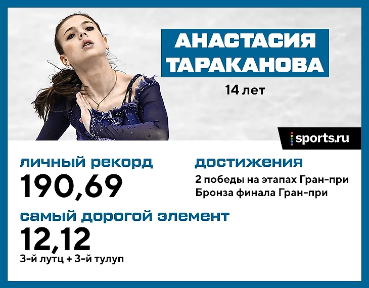 Единственная победительница этапов Гран-при не из группы Тутберидзе, но… тренировавшаяся у нее еще летом. В июле Настя перешла в академию Евгения Плющенко. Тот уверен: к концу сезона Тараканова прыгнет четверной тулуп, плюс в планах четверной лутц. И если не в этом, то в следующем сезоне (уже среди взрослых) Настя исполнит самые сложные прыжки.