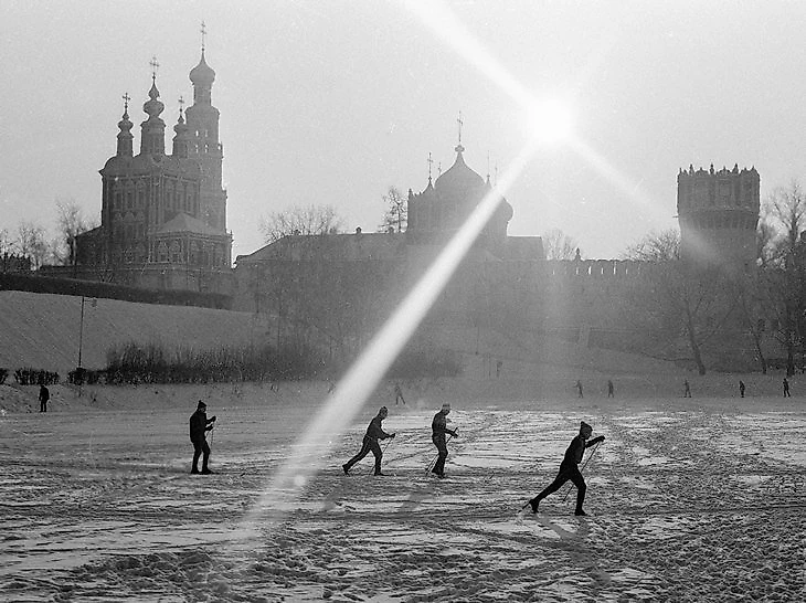 Кадр-жемчужина! Москвичи катаются на лыжах по замерзшему пруду у Новодевичьего монастыря. Такой столицы больше нет! Она сейчас, возможно, красивее и интереснее, но эпоха ушла.
