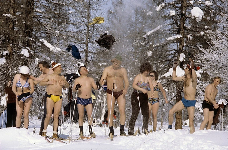 Отдыхающие на курорте Талая Магаданской области. Голые торсы и лыжи.