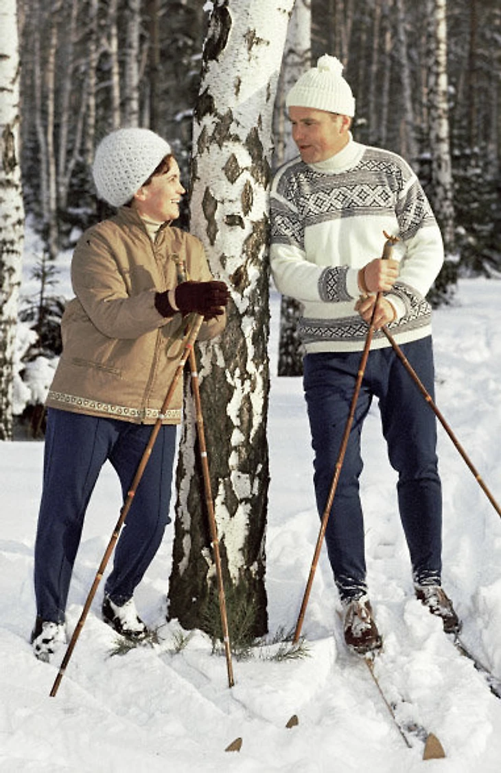 Летчики-космонавты Валентина Терешкова (слева) и Андриян Николаев одеты в духе времени. Но главное – на них вполне современные лыжи с креплениями!