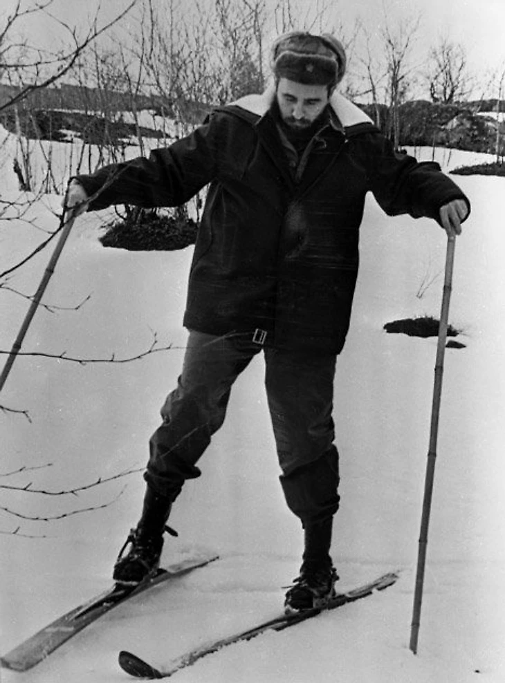 О, это уникальный кадр из апреля 1963-го! Визит в СССР Фиделя Кастро, лидера кубинской революции. Нет, знаменитый вождь, руководивший своей страной почти 50 лет, не в Москве. Его привезли в Мурманск – и там он познакомился с лыжами.