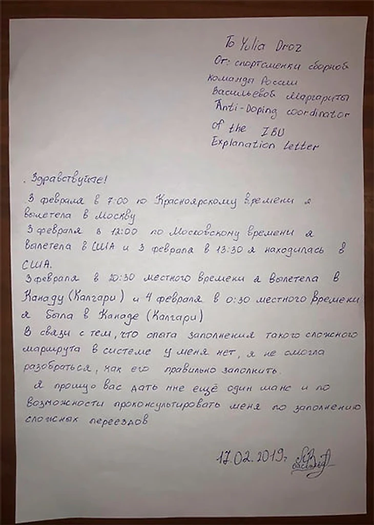 «3-4 февраля Васильева в течение полутора суток находилась в дороге. Именно в это время офицеры WADA прибыли по месту прописки спортсменки. Сама Васильева отправила в связи с этим объяснительное письмо на имя координатора WADA по России.