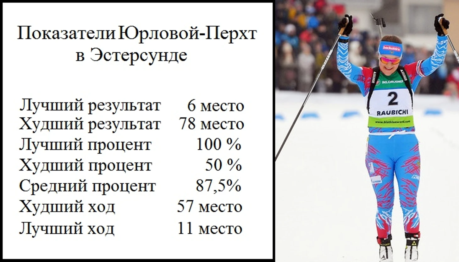 В отличие от всей женской сборной, Екатерина не понаслышке знает не только, что такое трасса в Эстерсунде, но и что такое чемпионат мира. В Швеции: Юрлова-Перхт в трёх последних гонках трижды стреляла с точностью в 90 процентов, у Екатерины лучшая средняя точность среди тех (немногих) спортсменов, которые провели больше пяти гонок. В карьере: самое неожиданное то, что Юрлова-Перхт в последние годы прибавила ходом и стабильна в этом (например, 11 ход в последней кубковой гонке Эстерсунда). Яркий этап в смешанной эстафете внушает оптимизм.