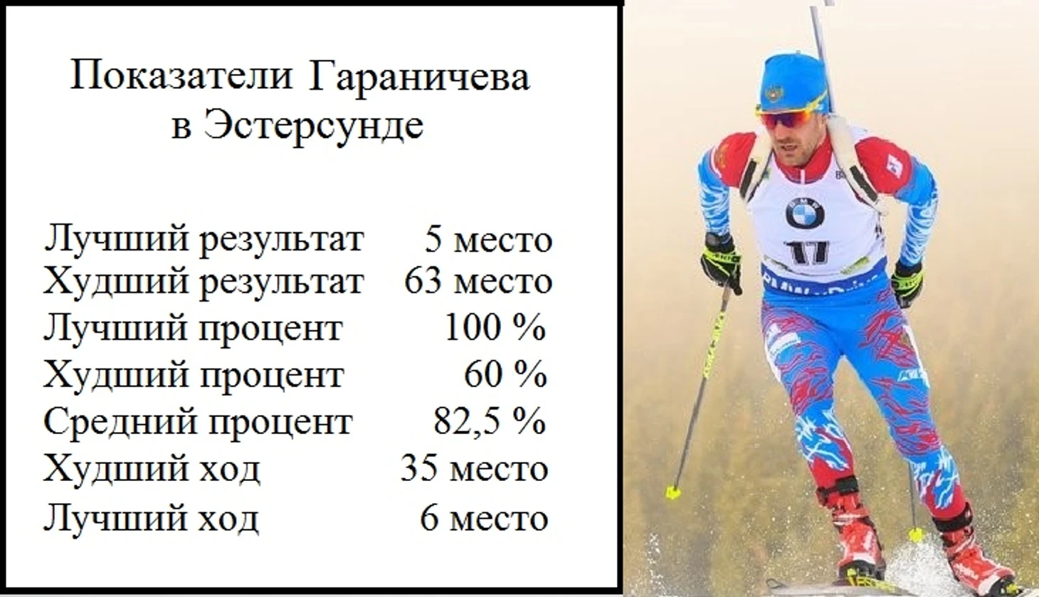 Евгений Гараничев намного опытнее Логинова в плане выступлений в Эстерсунде. Евгений стабилен ходом – в начале карьеры Гараничев часто был в 20-ке быстрейших, в последнее время – рядом с тридцаткой. Интересно то, что Гараничев прибавляет в точности. Это касается и этапа в Эстерсунде, и всей карьеры. В этом сезоне Евгений приблизился к отметке в 90 процентов (88,7) – пока это лучший результат в карьере. Можно рассчитывать на борьбу в индивидуалке, где Гараничев брал свою сочинскую бронзу.