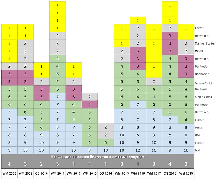 По общим итогам, сравнивая результаты сборной Германии это не бросается в глаза: (все места в ТОП-10 немецкой сборной на последний 13 ГС, справа указаны имена тех, кто заехал в ТОП10 на ЧМ 2019)