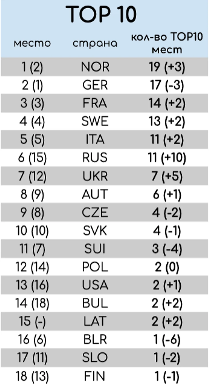 Но мы уступили по количеству ТОП10 мест Норвегии: