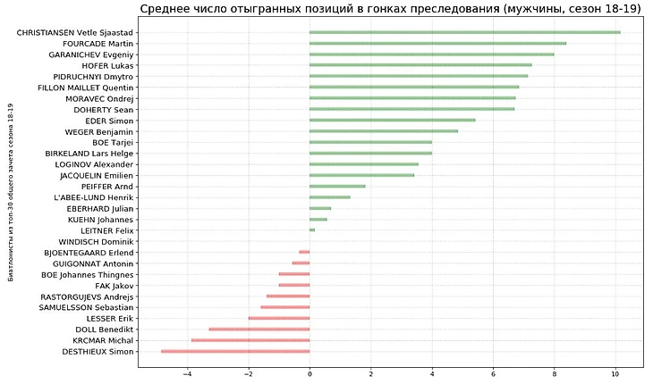Далее все просто: считаем, сколько в среднем биатлонист отыграл в преследованиях по сравнению со своими стартовыми позициями.