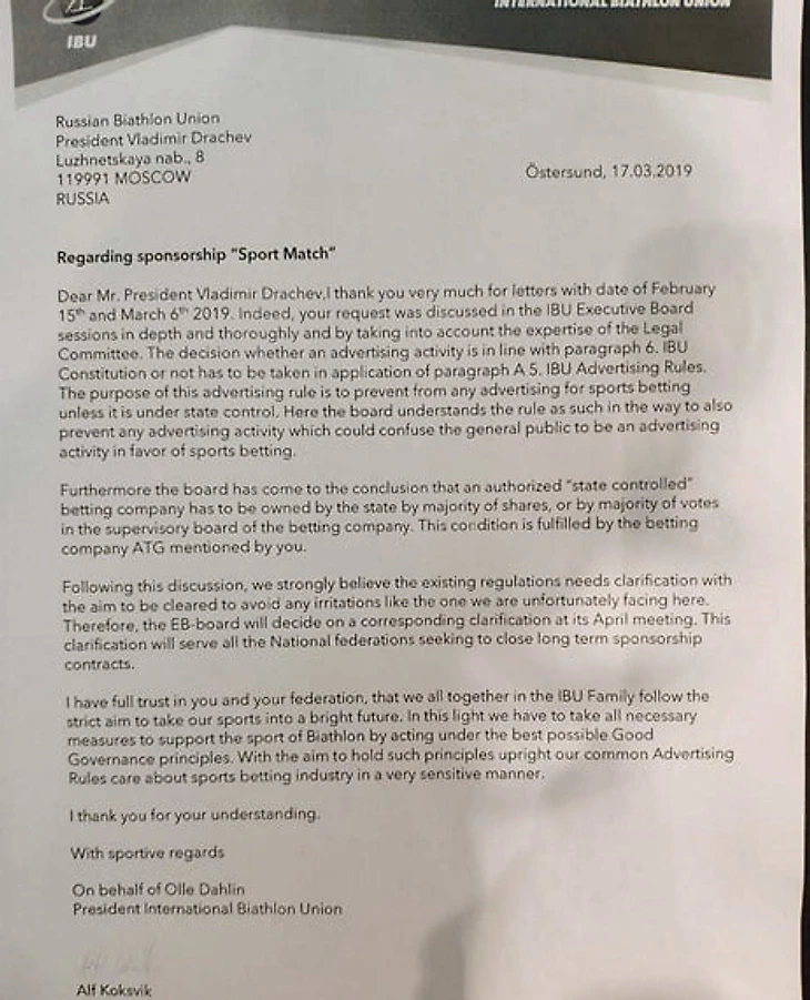 Генсек IBU (теперь уже бывший) Мартин Кухенмайстер разглядел за едва созданным СМИ «Париматч» одноименную букмекерскую контору. По правилам о рекламе, сотрудничество с букмекерами запрещено, кроме пары оговорок, касающихся государственного контроля над конторой. СБР потерял в деньгах, но сильнее всего Нуждова возмутило не это: босс IBU Олле Далин одновременно управляет и шведской федерацией – и их спонсирует букмекер. Больше подробностей – в этом тексте: